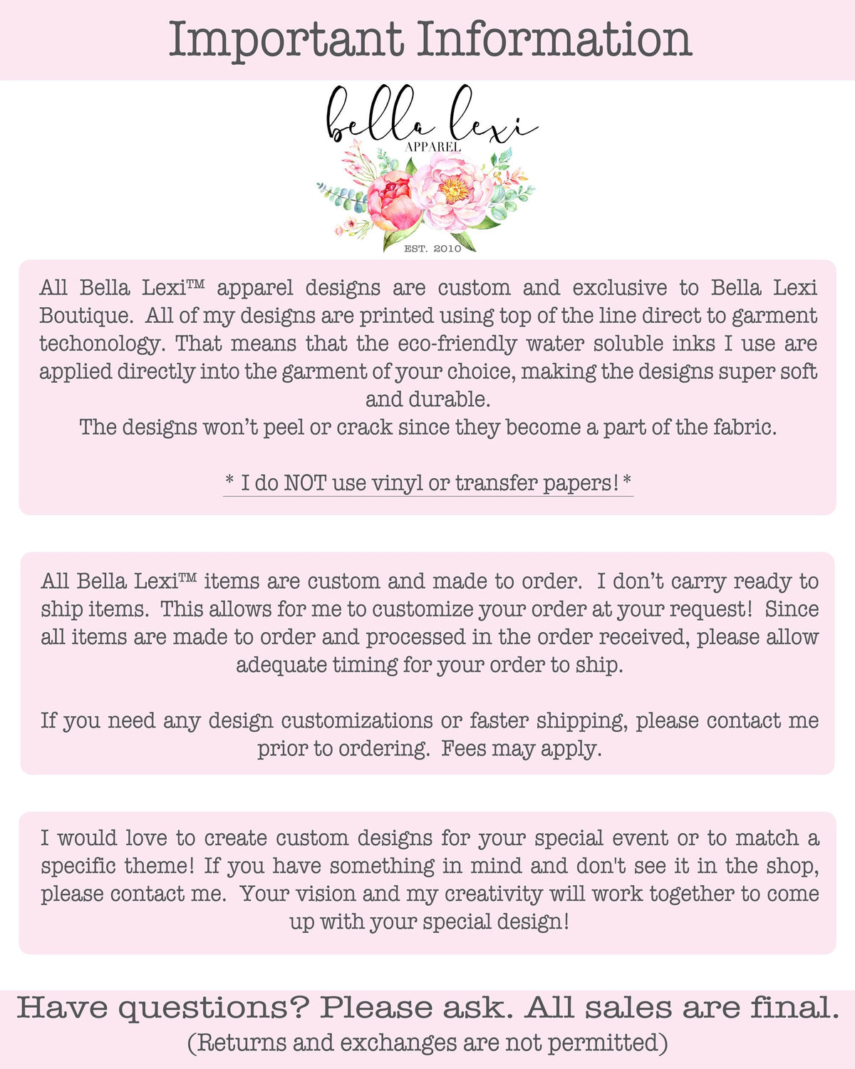 All of our Bella Lexi Boutique items are custom and made to order. We don’t carry ready to ship items. This allows for us to customize your order at your request! Since all of our items are made to order, please allow up to 5 business days for your order to ship.  Please contact us prior to ordering if you need any customizations or faster shipping. Fees may apply.