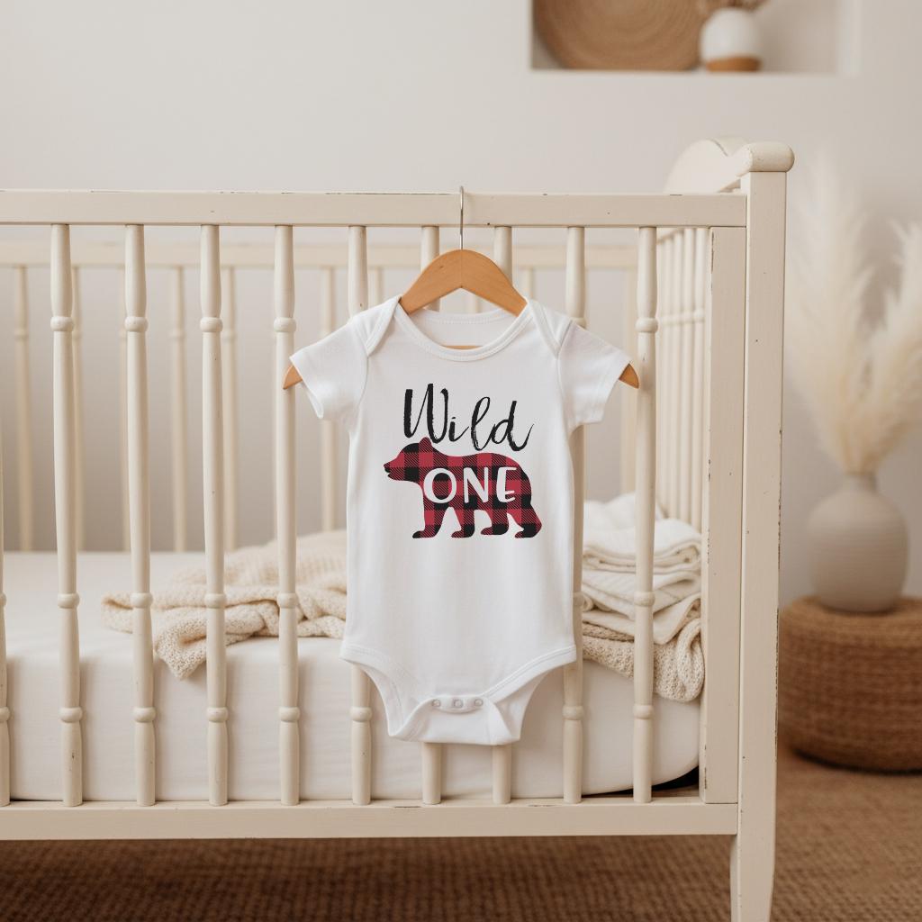 Wild One Birthday Shirt. This adorable Lumberjack Bear Theme Birthday design features a red and black buffalo plaid print bear and the words "Wild One" This is such an adorable shirt for your little one's birthday celebration! Makes a great birthday gift for the little lumberjack cub in your life! Family set available!