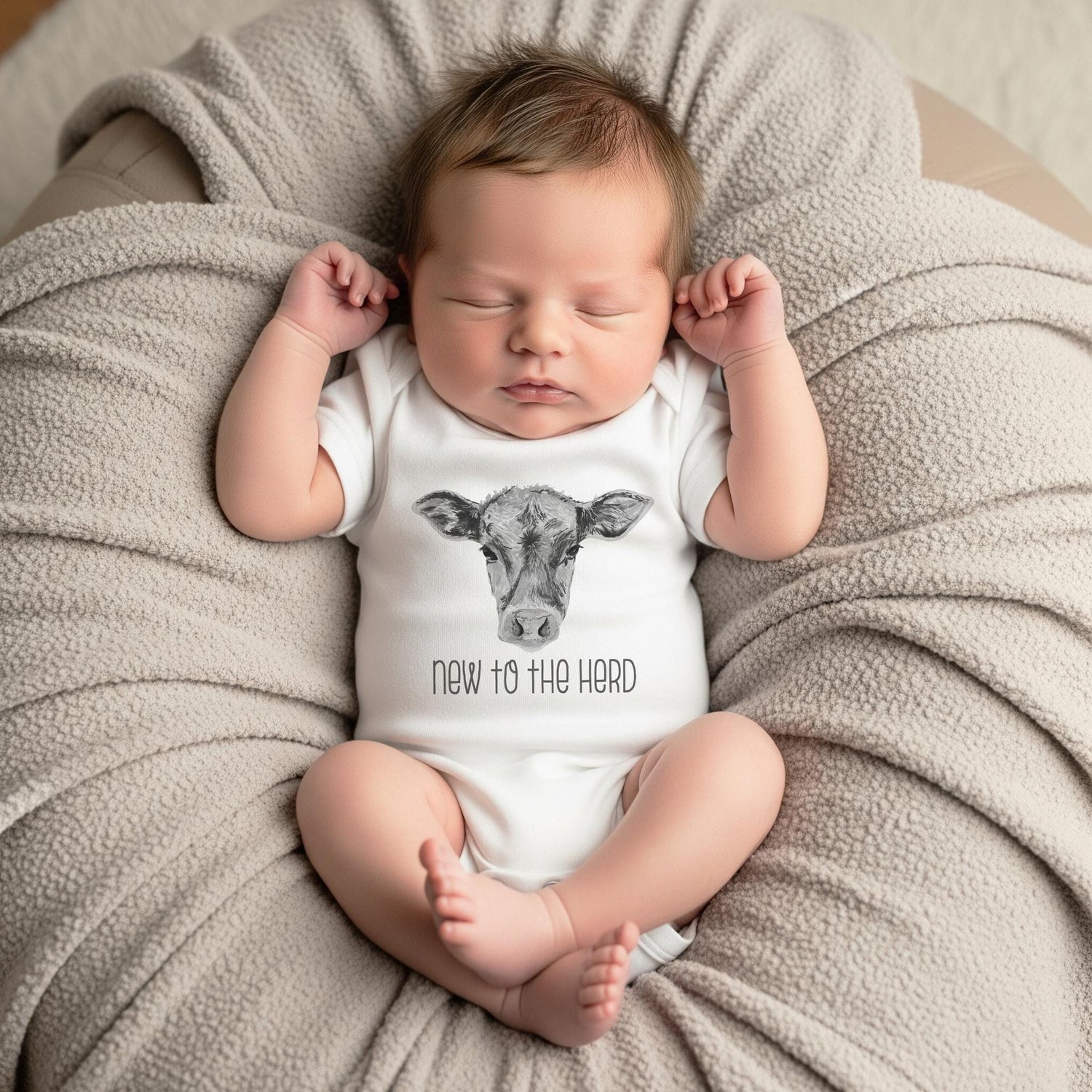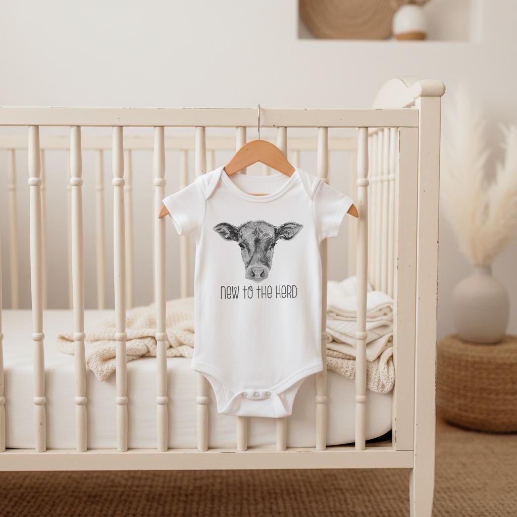 "New to the Herd” This cute and funny country theme baby bodysuit or t-shirt is sure to make your loved ones smile! It features an adorable hand drawn style cow with the words "new to the herd" in gray. Makes a great baby shower gift! Perfect for the newest little cowboy in your life!