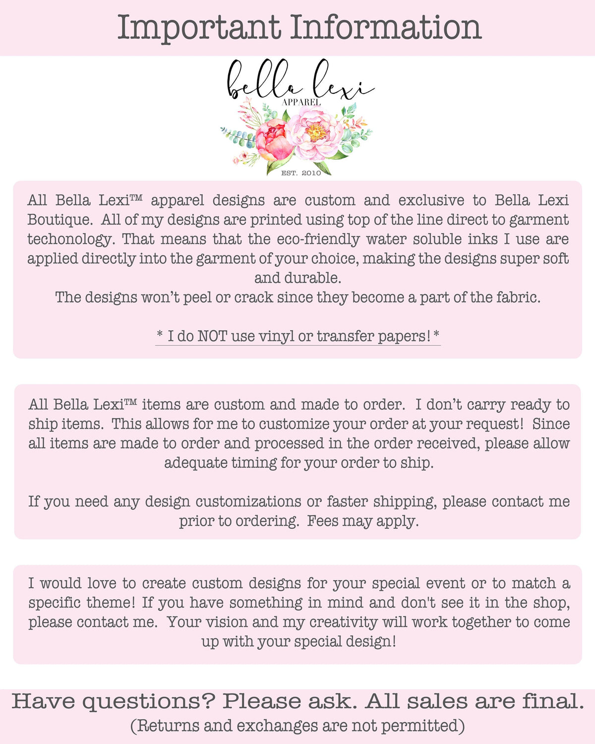 All of our Bella Lexi Boutique items are custom and made to order. We don’t carry ready to ship items. This allows for us to customize your order at your request! Since all of our items are made to order, please allow up to 5 business days for your order to ship. Please contact us prior to ordering if you need any customizations or faster shipping. Fees may apply.